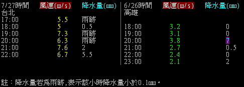 至於洪一中教練有沒有主觀認定呢?我相信他沒有去查過氣象局的資料,不過既然聯盟把兩場比賽拿來比較了,自然也會有熱心球迷去統計相關的氣象資料。以下是Ptt La New熊板板友gingling列出的兩日風速與雨量數據: