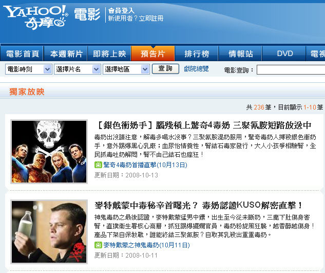 而且點進去還真的有「銀色衝奶手」和「神鬼毒奶:最後標準」兩部預告片,我不是很常用雅虎的服務,所以不是很清楚這是由雅虎集團的員工製作的,或是由網友整理上傳的,不過把這種KUSO短片和「20世紀少年」和「海角七號」等正經的預告片放在一起,總覺得有說不出來的違和感。