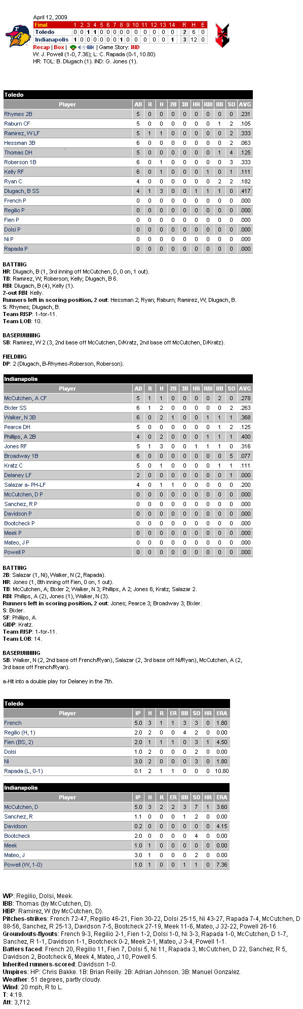 Mud Hens隊最後還是以2:3輸掉這場比賽,因為在14局下半接替倪福德投球的左投Clay Rapada被連續敲出安打,最後這場比賽被以再見安打結束,這也是Mud Hens隊開季三連勝後,所吞下的第一敗。