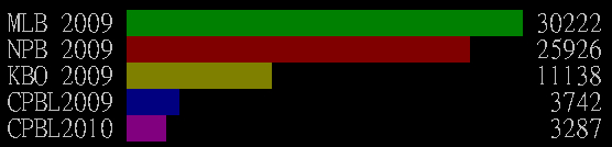 最近中華職棒的球迷又在討論各隊觀眾人數的消長,每次看到這樣的討論,我都會想起類似底下這樣的圖:中職各隊的觀眾人數不管是四千出頭還是兩千五,和其他國家的職棒球隊比起來,連在韓國職棒票房敬陪末座的NEXEN英雄隊的觀眾人數都打不過。蝸牛角上爭何事呢?(陳穎)