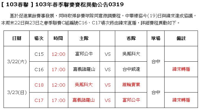 而在原本該播中華職棒賽事的時段,緯來體育台的節目表上標明了將會進行103年度全國成棒甲組春季聯賽直播。但有趣的是,查找棒協官網的春聯賽程表,這個時間點並沒有任何比賽開打: