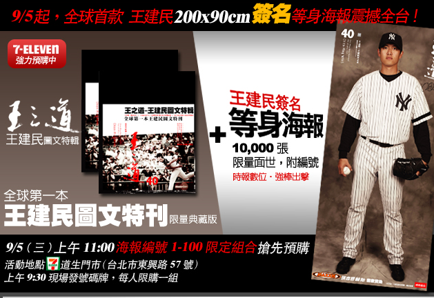 一項更難得的活動,在9月5日預購首日這天,《王之道─王建民圖文特輯》與「王建民限量編號簽名等身海報」的前100號(編號1至100)